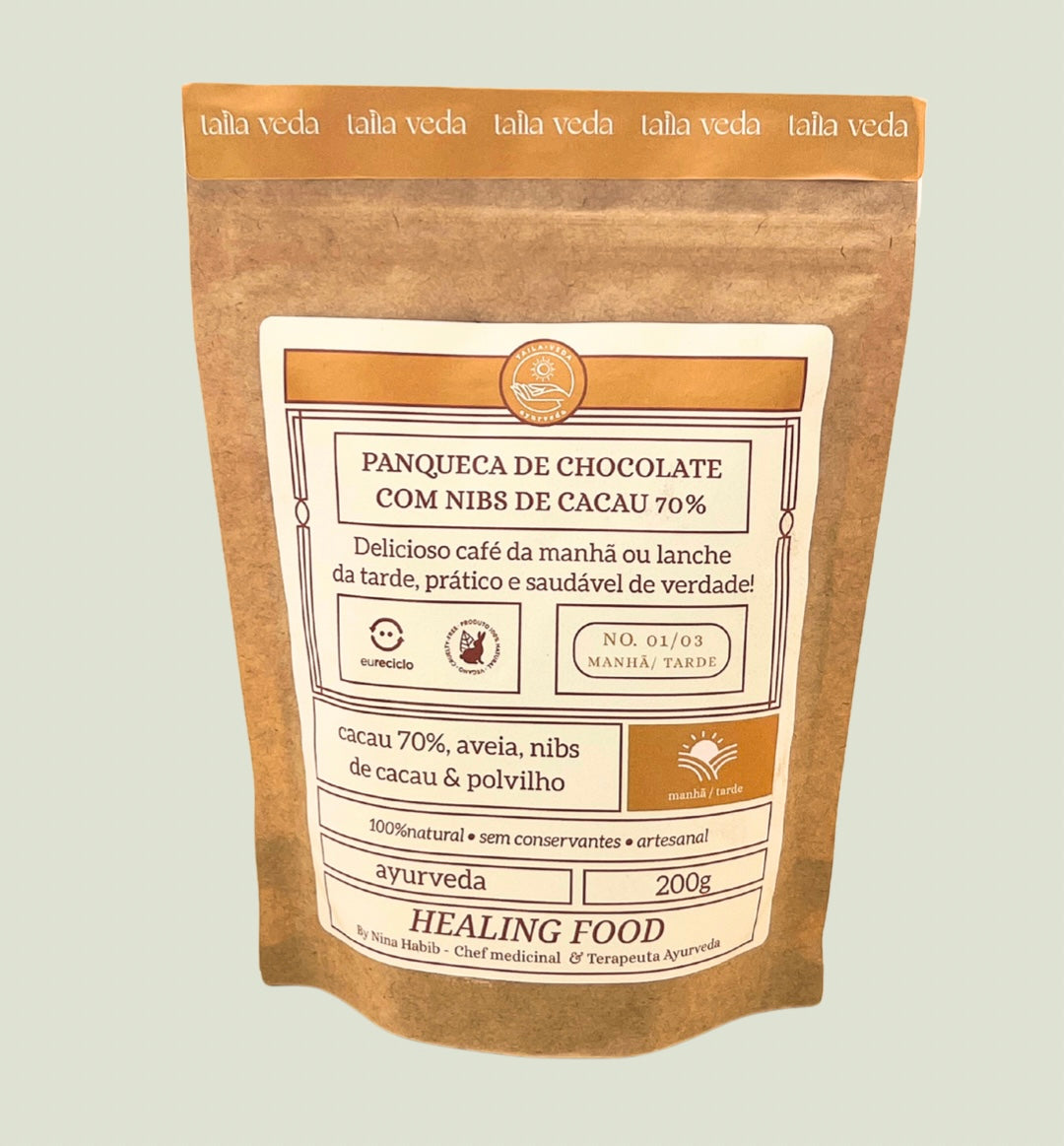 A Panqueca de Chocolate com Nibs Taila Veda Panqueca é uma opção deliciosa e saudável para quem busca uma experiência única de sabor e nutrição. Combinando cacau 70% em pó, nibs de cacau e aveia, esta mistura permite que você prepare panquecas irresistíveis em questão de minutos.