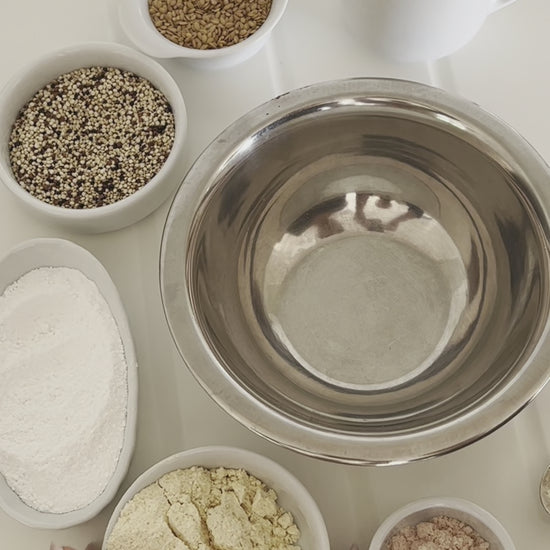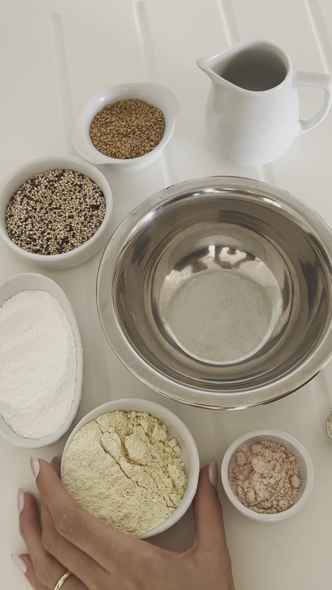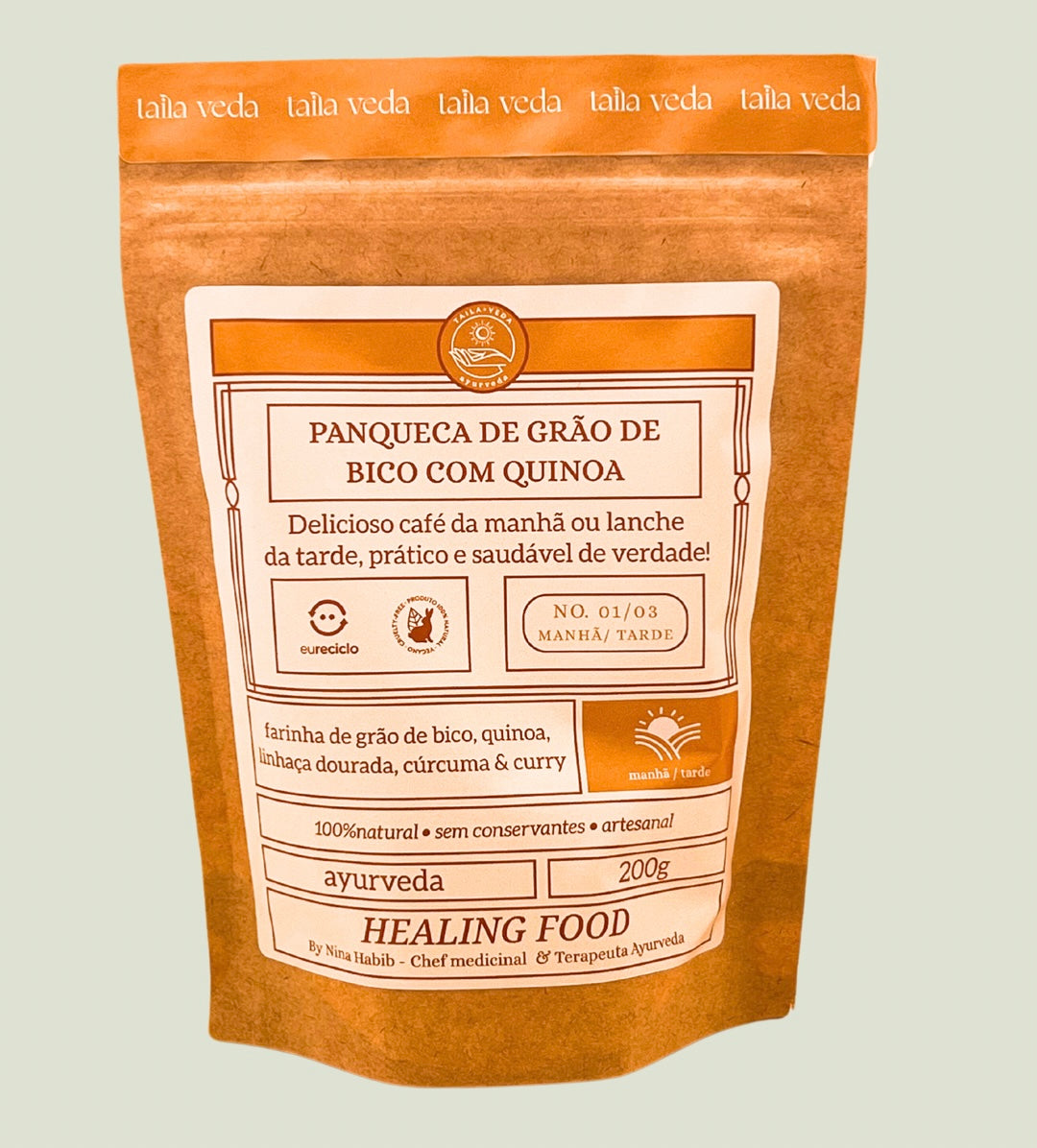 Ingredientes: farinha de grão de bico, quinoa, semente de linhaça, cúrcuma, curry e polvilho.