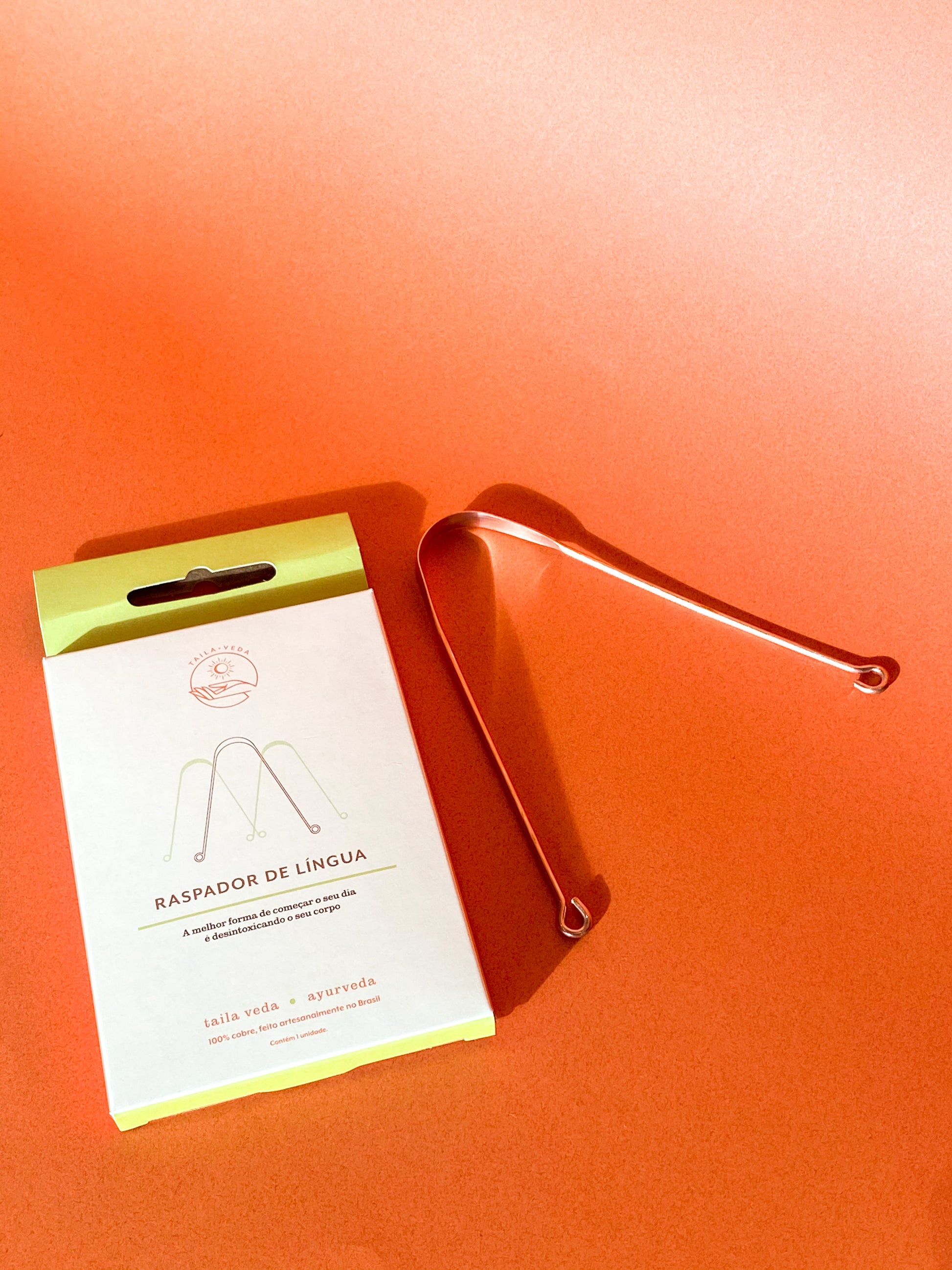 Nosso raspador é produzido artesanalmente, feito 100% em cobre, produto brasileiro com duração de uma vida inteira. O cobre tem propriedades anti-inflamatórias, bactericidas, antioxidantes e também controla o pH da boca.