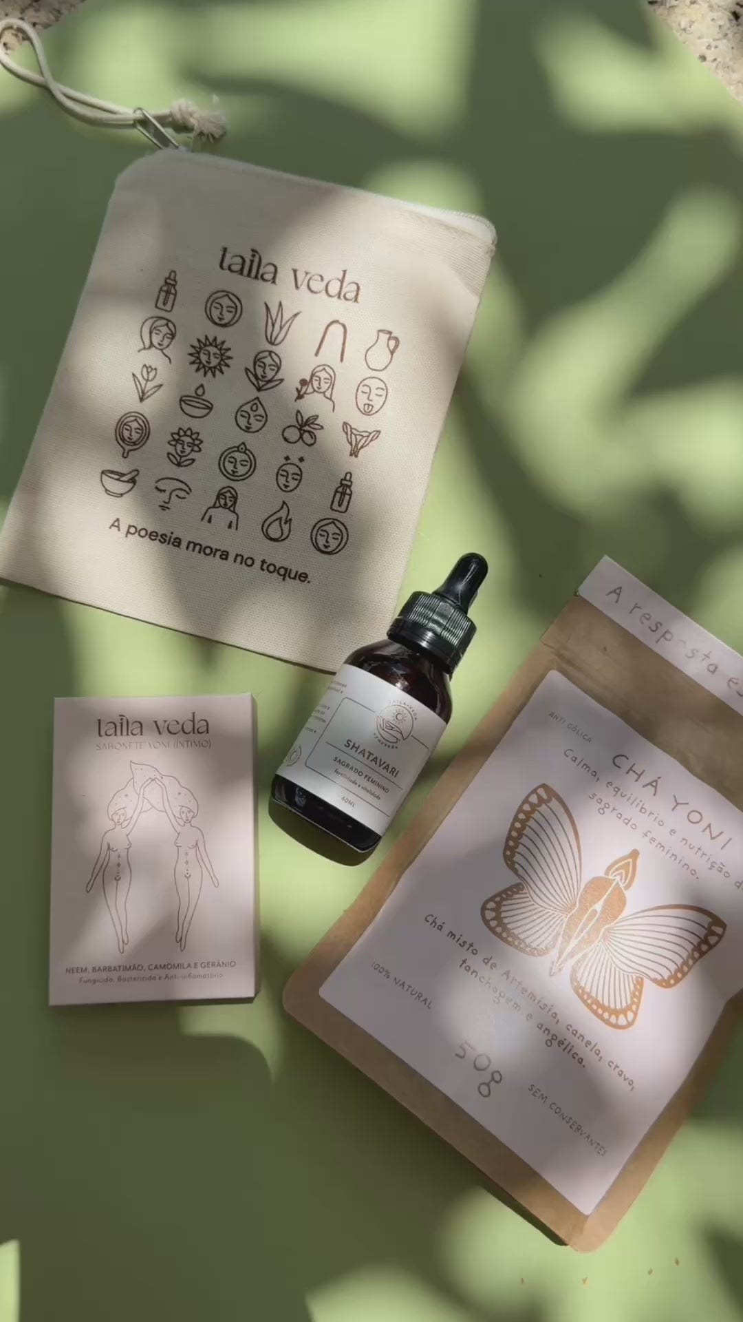 O Kit Yoni foi criado para acolher o feminino em todas as suas fases com suavidade, presença e saber ancestral. Ele reúne o óleo Shatavari, formulado para o ritual no ventre e nos pontos marma; o sabonete Shatavari, pensado para um banho delicado e reconfortante; o Chá Yoni, com ervas tradicionalmente usadas para aquecer, nutrir e trazer presença ao útero; o livro digital Yoni, escrito por Nina Habib, que aprofunda o olhar sobre o corpo feminino; e a bolsinha ilustrada Taila Veda, criada para acompanhar seu ritual onde você for.
